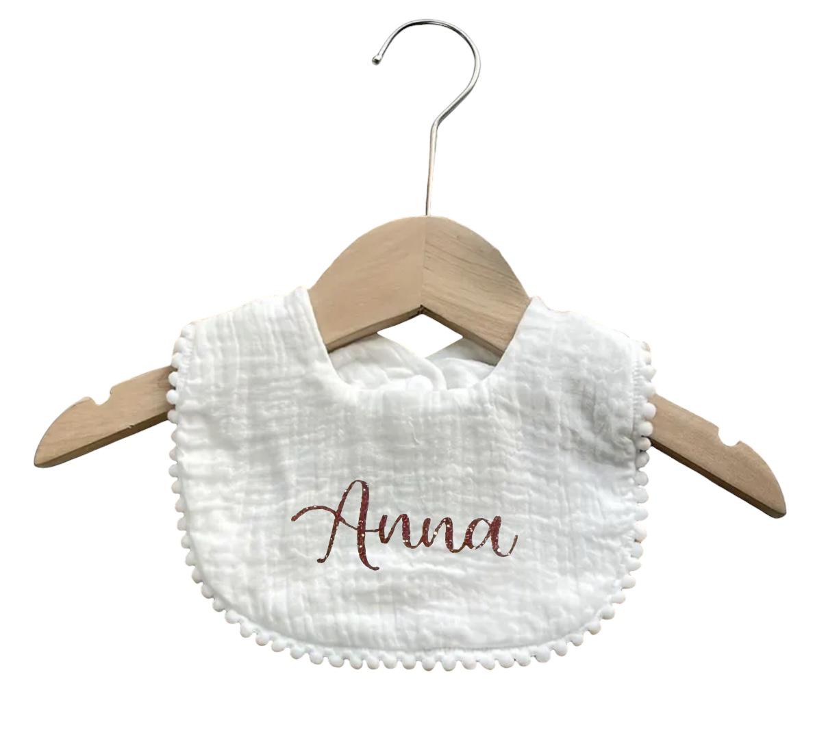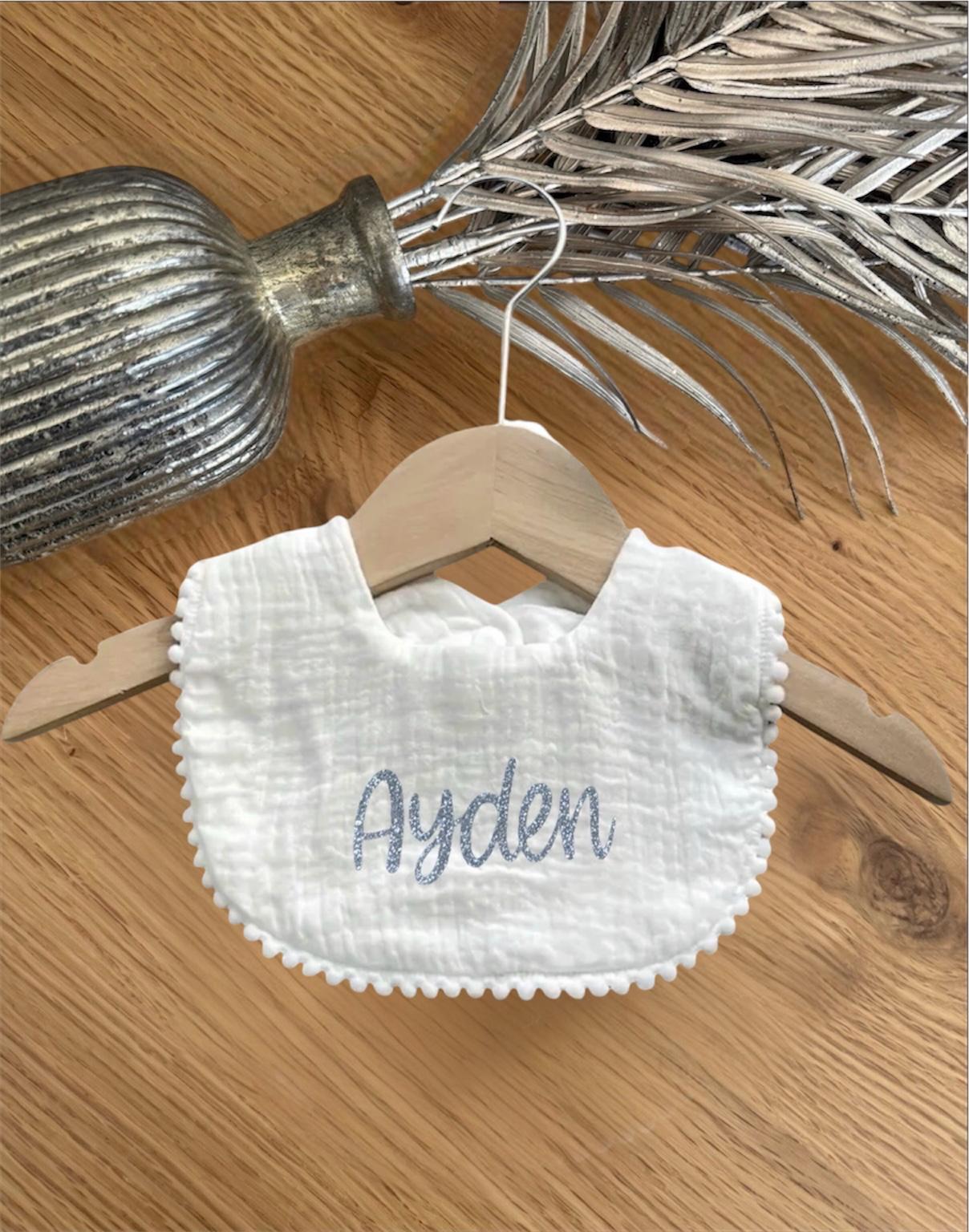 Offrez à bébé un accessoire aussi mignon qu’utile avec ce bavoir en gaze de coton douce, orné d’un flocage pailleté au prénom de votre choix ✨
